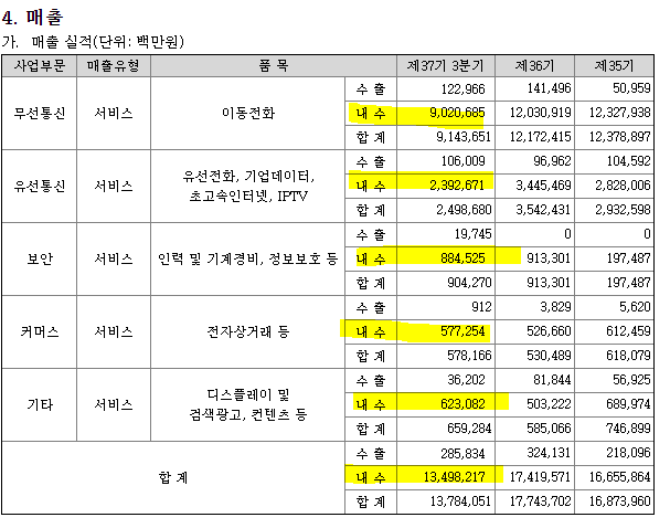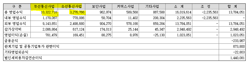 그럼에도 주요 사업은 통신사업이며, 실제로도 수익성은 통신에서 대부분 발생하고 있습니다. 아래 표를 보면 이를 확인할 수 있습니다.
