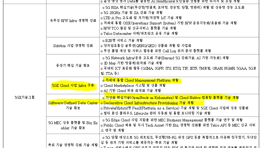 5GX Cloud 사업 Infra 구축에서는 차세대 통합 클라우드 매니지먼트 플랫폼을 개발하고 있으며, Software-Defined Data Center 기술 확보를 통해 가상화 핵심기술 및 클라우드 네이티브 컴퓨팅 플랫폼 기술 개발을 한다는 것을 확인할 수 있습니다.