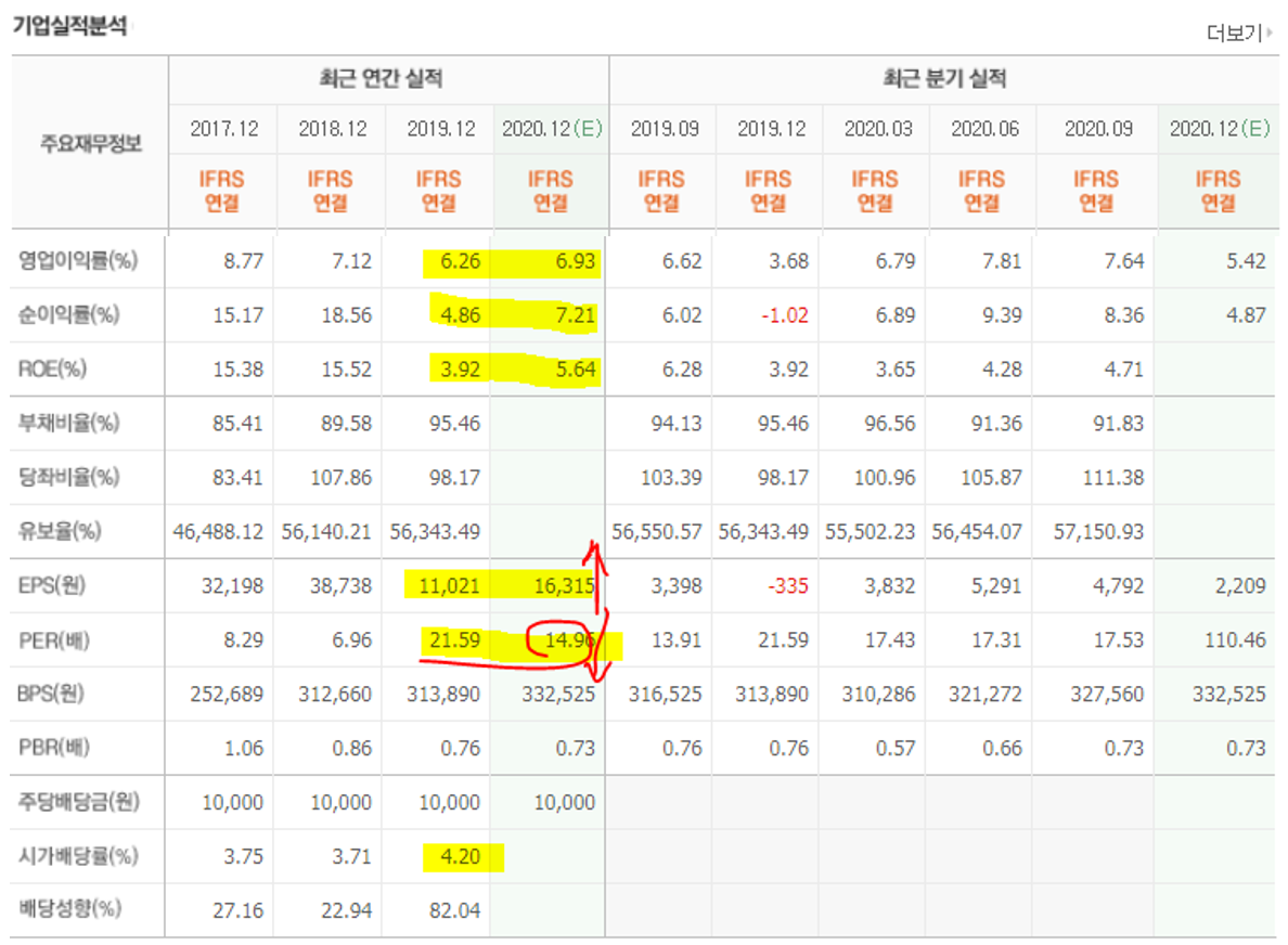 ROE의 경우, 최근 2년은 3.92%에서 5.64%를 보이고 있습니다. 주당순이익(EPS)는 지난해 대비 약 50% 증가하면서 좋은 흐름을 보이고 있으며, PER은 2년 사이 평균 18배 정도를 보이면서 경쟁사들에 비해 높은 평가를 받고 있는 상황입니다.