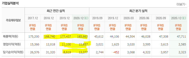 부채비율이나 당좌비율은 건전한 편이라 할 수 있는데, 아무래도 영업이익만 해도 1년에 1조 2천억 원 규모에, 현금및현금성자만 규모도 1조 8천억 원 정도로 자금여력은 충분한 회사라 할 수 있습니다.