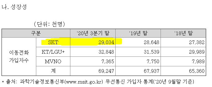국내 이동전화 가입자수 /출처 SK텔레콤 2020년 3분기 분기보고서 국내에서 SK텔레콤 가입자는 2020년 3분기 말 기준으로 약 2,900만 명이며, 경쟁사 KT와 LG유플러스를 합한 수치와 큰 차이가 없다고 볼 수 있을 만큼 탄탄한 1위 기업으로 자리매김하고 있습니다.