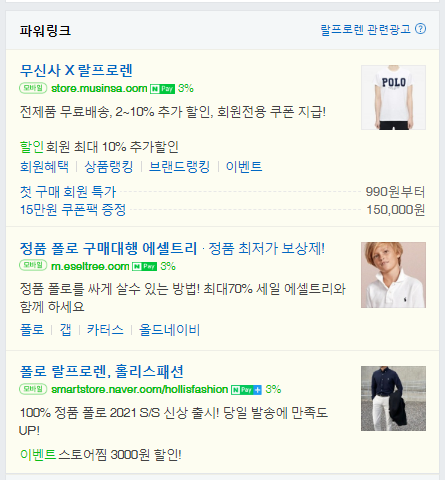 파워링크 /출처 네이버 이외에도 위와 같이 네이버 검색 시 결과화면 상단에 고정으로 배치되는 '파워링크'라는 광고 공간도 마련하여 광고 수익을 얻고 있는데, 이처럼 네이버는 '네이버'라는 플랫폼에서 정말 다양한 형태의 광고를 제공하면서 광고주들에게 다양한 수단을 제공하고 있습니다.