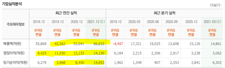 네이버의 2020년 말 기준 매출액은 약 5조 3,041억 원이며, 영업이익은 1조 2,153억 원을 보였습니다. 2019년부터 매출액은 꾸준한 성장을 보였으며, 올해 전망치 또한 20%대의 매출 성장과 영업이익 성장을 전망하고 있는 상황입니다.