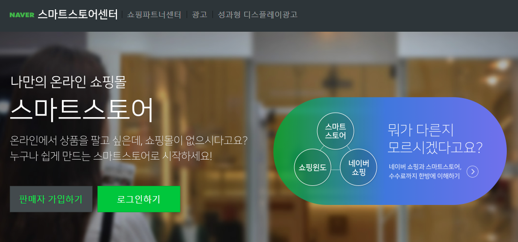 스마트스토어 판매자들에게 풀을 제공하는 네이버스마트스토어센터 /출처 네이버 쉽게 말해, 네이버쇼핑은 이미 시중에 유통되고 있는 브랜드들이 입점된 형태, 스마트스토어는 소상공인 또는 개인사업자들을 위한 온라인쇼핑몰 구축 플랫폼이라고 보시면 되겠습니다.