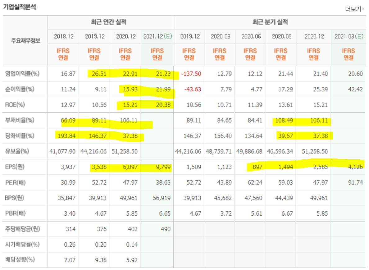주주 입장에서 어쩌면 가장 중요한 EPS(주당순이익)는 2020년 약 2배 가까지 상승했으며, 2021년 전망치 또한 약 50%로 높은 수준에 형성되어 있습니다.