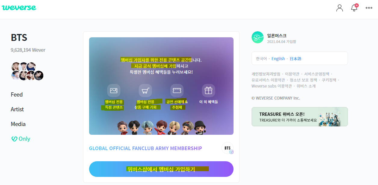 네이버가 49% 지분을 보유한 하이브(옛 빅히트엔터테인먼트)와의 합작법인 위버스컴퍼니 서비스 '위버스' /출처 위버스 위에서 언급한 '위버스'라는 서비스에 대해 더 알아보면(저는 해당 서비스가 향후 확대 가능성이 높고, BTS(방탄소년단), 블랙핑크를 시작으로 한류가 더욱 거셀 것으로 보고 있는 바, 그 잠재성을 긍정적으로 보고 있습니다),