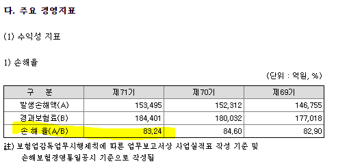 삼성화재 수익성지표 중 손해율 /출처 삼성화재 2020년 사업보고서 삼성화재의 손해율은 83.24%로 전년대비해서는 낮으졌지만 평균적으로 비슷한 수준을 유지하고 있습니다. 해당 비율이 더 높아진다면 이는 삼성화재의 보험영업에 있어 악재라고 보시면 됩니다.