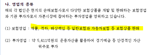기타사업 중에서 영업수익 기준 54.52%가 손해사정서비스, 22.41%가 고객상담서비스에서 발생하는 것으로 미루어보아, 백업을 해주는 지원사업으로써, 주된 사업이 아닌 것으로 보입니다.