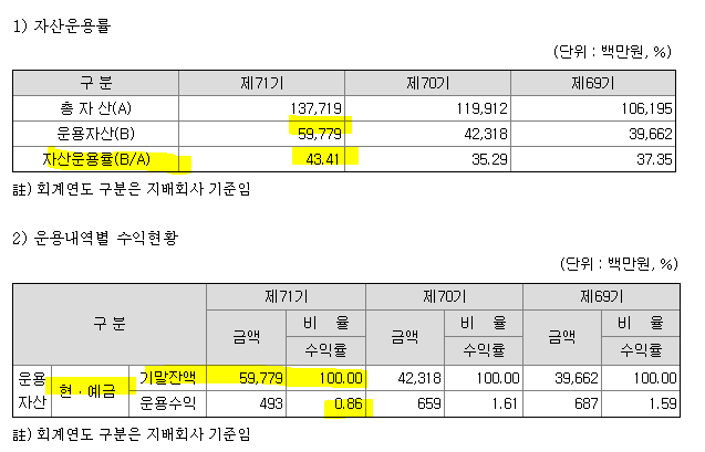 그리고 모든 운용자산이 현금및예금에 들어가 있기 때문에 딱히 수익을 바라고 하는 사업은 아닌 것으로 보입니다.