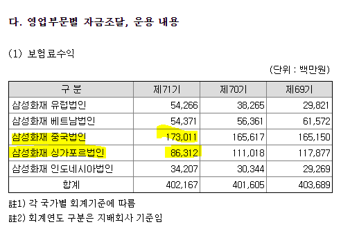 국가별 비중은 중국법인과 싱가포르 법인이 가장 높은 상황이빈다. 그리고 유럽법인과 베트남 법인이 그 뒤를 잇고 있는데, 국가 GDP 규모를 고려하건데 베트남 법인에서 발생한 수입보험료가 상당히 높다는 생각이 드는 대목입니다.