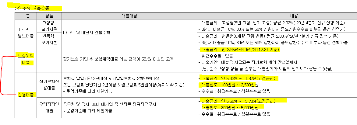 장기보험신용대출의 경우에는 대출한도는 100만 원에서 2,500만 원으로 우량직작인 대출보다는 낮지만, 대출금리가 그에 못지 않게 높아(5.33%~11.87%) 돈이 되는 상품으로 보입니다.
