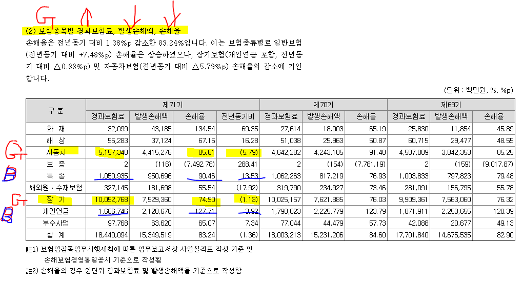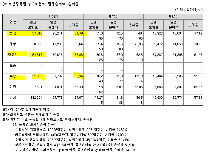 이는 지급보험금및환급급이 많고, 재보험료비용이나 보험계약부채전입, 지급경비 등이 뒤따르는 사업구조 때문입니다.