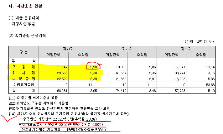 그럼에도 국공채에서 5.98%(인도네시아 법인), 수익증권에서 2.39%(중국법인), 회사채에서 2.38%(싱가포르법인) 수익률을 거둔 것으로 보아, 평균 2.95% 정도로 수익률을 보인 것을 알 수 있습니다.