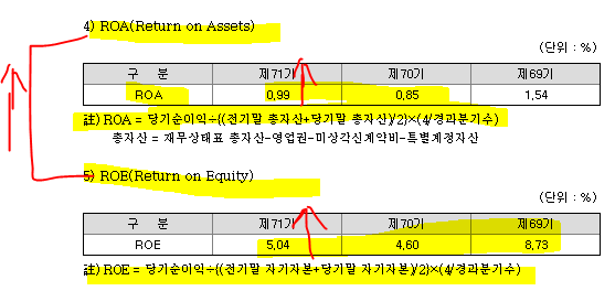 ROA의 경우는 당기순이익을 평균 총자산으로 나눈 개념이라고 보면 되는데, 회사가 보유한 자산을 이용해 얼마만큼의 순이익을 내는지 '자산이용 효율'을 평가하는 수익성 지표입니다.