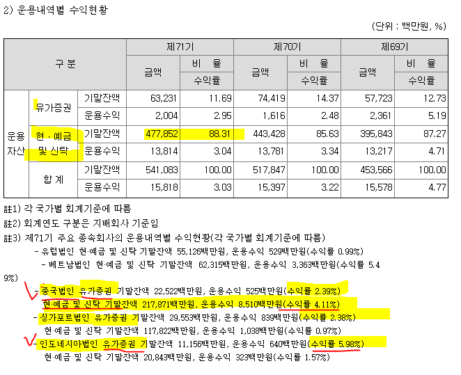 그럼에도 국가별 금리가 다르기 때문에 인도네이사법인의 경우 수익률이 5.98%에 달했으며(유가증권 기준), 중국법인의 경우에는 유가증권 2.39%, 현,예금 및 신탁이 4.11%로 최근 국내 기준금리(0.5%)에 비해 높은 수익률을 보였습니다.