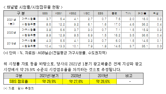 국내 채널별 시청률 및 시청점유율 현황, 전체 지상파 광고시장에서 SBS 점유율 /출처 SBS 2021년 1분기 분기보고서 그중에서도 지상파에 들어가는 광고주들이 굵직한 기업들이 많기 때문에 지상파 입장에서는 전체 지상파 광고시장 내에서의 시청점유율이 더욱이 중요하게 작용합니다.
