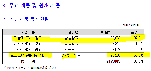 SBS 주요 제품별 매출 비중 /출처 SBS 2021년 1분기 분기보고서 2021년 1분기 기준 지상파 TV 광고에서는 37.8% 비율을 보였으며, 프로그램 판매 등 기타 부분으로 분류된 사업수익이 전체 매출의 약 57.7%를 차지했고, 금액 규모는 약 1,242억 원을 기록했습니다.