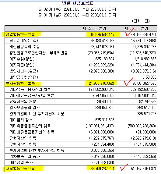 투자활동현금흐름의 경우에는 투자를 위해 지출된 금액이 많을 수록 기업이 미래 먹거리를 위해 투자하고 있다는 뜻이므로 현금 유출인 음의 수치를 보이는 것이 긍정적입니다(제대로된 성과가 나온다는 전제하에).