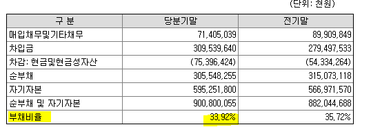 매입채무및기타채무와 차입금을 합하고, 거기에서 기업이 가진 현금및현금성자산을 제한 '순부채'를 기준으로 산출하는 순부채비율의 경우에는 33.92% 수준으로 자기자본이 상당히 많은 기업임을 확인할 수도 있습니다.