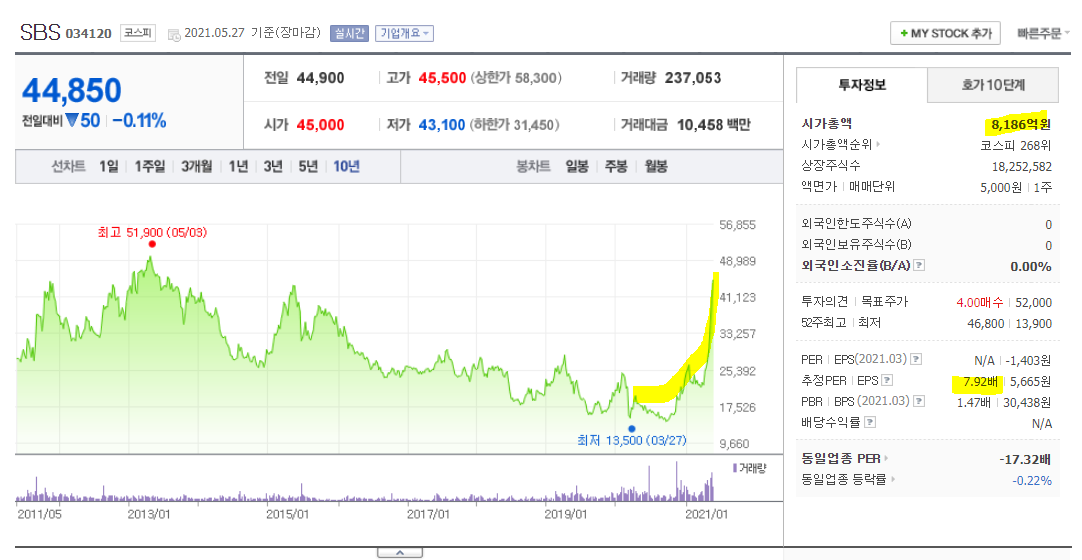 SBS 10년 주가그래프 /출처 네이버금융 자, 그럼 에스비에스 주가전망을 해보겠습니다. 2021년 5월 28일 장마감 기준 SBS의 시가총액은 8,186억 원, 주가는 44,850원, PER은 7.92배에 형성되어 있습니다.