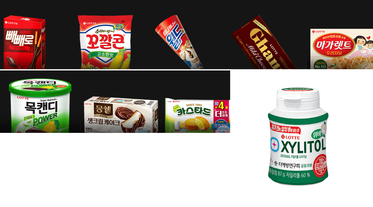 출처 롯데제과 공식홈페이지 사진 편집 롯데제과의 대표적인 브랜드 제품(일명 메가브랜드)으로는 2000년 출시된 자이리톨 시리즈에서부터 빼빼로, 꼬깔콘, 월드콘, 가나 초콜릿, 몽쉘, 마가렛트, 목캔디, 카스타드 등이 있습니다.