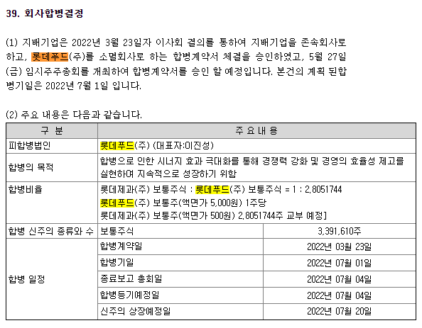 출처 롯데제과 2022년 1분기 분기보고서 최근에는 롯데푸드와의 합병(2022년 7월 1일부로 합병완료 예정) 이슈도 있어 재무적인 변화가 있을 것으로 예상됩니다.