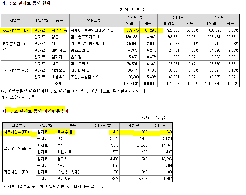 실제로 사료사업부 원재료 가격이 지난 3년간 급증하면서 원재료 가격 부담이 증가한 바 있으며, 매입액 또한 2022년 반기 기준만 하더라도 2020년 한 해 동안의 매입액을 상회하고 있습니다.