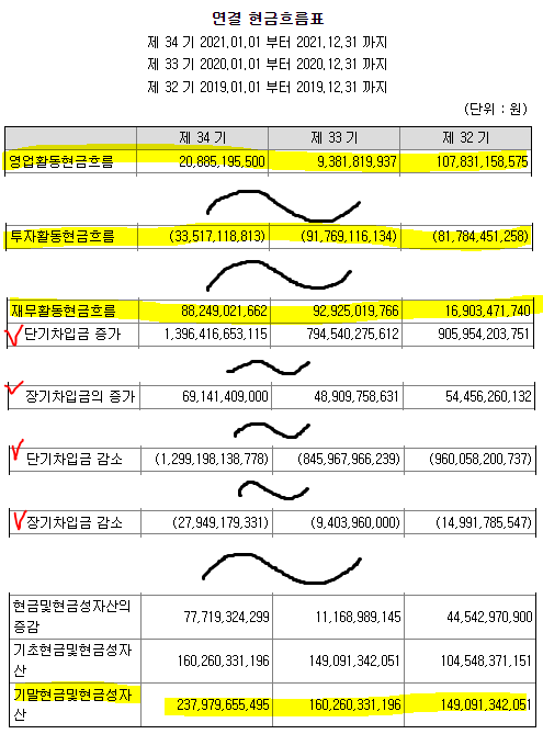 재무활동현금흐름 측면에서는 장단기 차입을 전방위적으로 활용하고 있는데, 이에 대한 상환이 매 기간 증가액보다 적은 수준입니다.