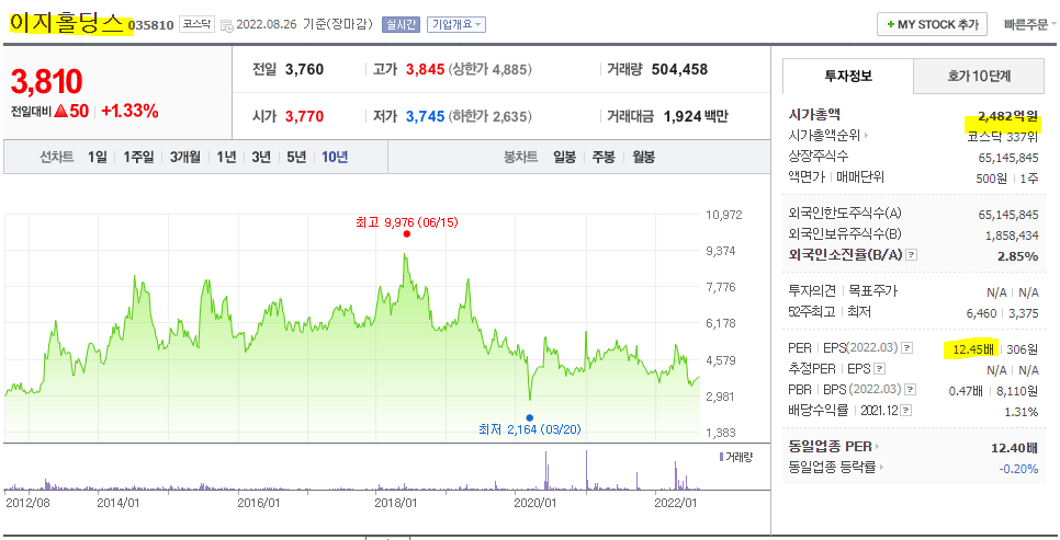 출처 네이버금융 마지막으로 이지홀딩스 주가전망치를 계산해보며 마무리하겠습니다. 우선 이지홀딩스 2022년 8월 26일 장마감 기준 현재 시가총액은 2,482억 원이며 주가는 3,810원에 형성되어 있습니다.