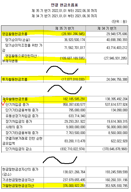 이지홀딩스 2022년 반기 기준 현금흐름표 정리 /출처 이지홀딩스 2022년 반기보고서 2022년 반기 기준으로는 영업활동현금흐름이 마이너스를 보이고 있는데, 이는 일시적인 사유일 거라 생각하지만 '영업활동으로 인한 자산 부채의 변동' 부분 금액이 전년 동기 대비 3배 이상 수준이라 살펴보았습니다.