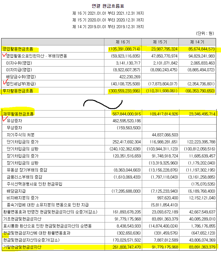 구체적으로 재무건전성을 살펴보기 위해서 아래에서 과거 3년 현금흐름 및 최근 현금흐름을 살펴보겠습니다.