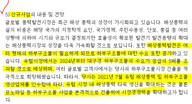 반기보고서에서 언급되고 있는 바와 같이 유럽 시장에서는 2024년부터 대구경 하부구조물 수요가 공급의 5배를 초과할 것으로 보인다고 하며, 이를 신규 먹거리로 보아 2021년 7월 유럽 해상풍력 및 하부구조물 생산업체를 인수했습니다.