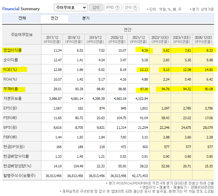 여기에 현금및현금성자산이 약 2,936억 원으로 증가하면서 자금 여력을 늘리고 있습니다. 금리인상기에 적합한 준비라 보이며 재무건전성 측면에서 좋은 대비책으로 보입니다.