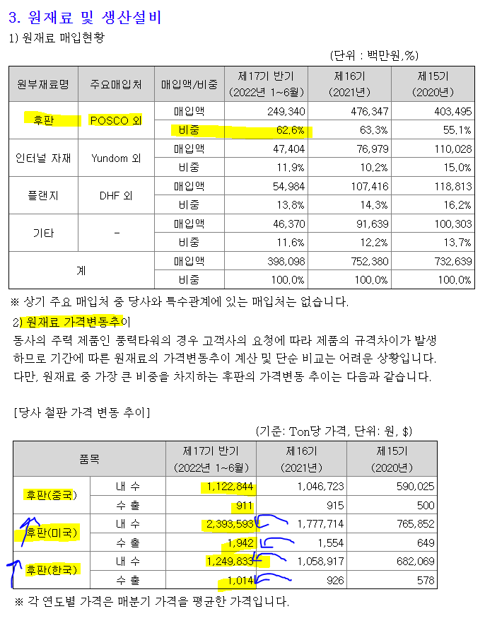 출처 씨에스윈드 2022년 반기보고서 상당 부분을 포스코(POSCO)에서 공급받고 있으나, 미국, 한국 등 주요 매입 국가들의 후판 가격이 상승했기 때문에 이로 인한 원재료 가격 부담을 피할 수는 없어 보입니다.