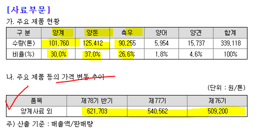 출처 대한제분 2022년 반기보고서 대한제분 매출 구성 중에서 가장 큰 매출 비중을 차지하는 사업부문은 계열사 대한사료를 통한 사료 부분인데, 구체적으로 대한사료 제품 구성을 살펴보면 아래와 같이 양돈/축우/양계 순서로 가장 많은 비중을 차지하고 있습니다.