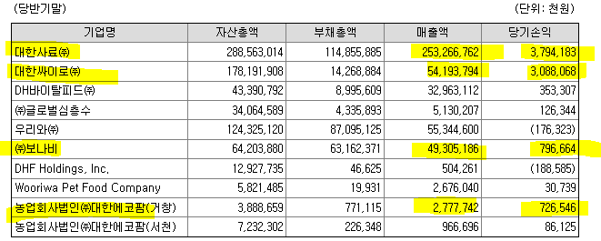자체사업 보다는 대한사료(사료사업)/대한싸이로(하역및창고보관)/우리와(반려동물서비스업)/보나비(음식점업)/대한에코팜(양돈업) 등 종속회사를 통한 실적을 연결 기준으로 인식하는 회사입니다.