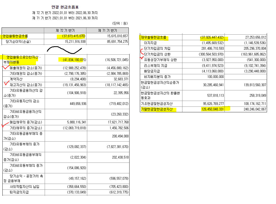 재무활동현금흐름의 경우, 2022년 반기 기준으로 단기차입에 대한 상환액 규모가 차입 규모보다 컸다는 점, 유동성장기부채의 상환이 대거 발생했다는 점을 미루어 볼때 자금확보에 총력을 기울이는 모습입니다.