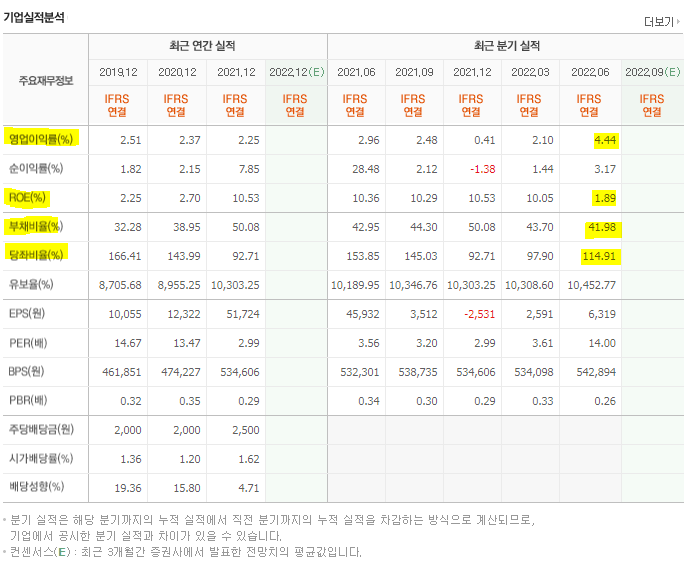 출처 네이버금융 이어서 대한제분 재무비율을 살펴보면 영업이익률은 2~4% 수준으로 정말 낮은 편입니다. ROE의 경우에는 평균 10% 수준이었으나 2022년 2분기 기준으로는 2%를 하외하고 있는 상황입니다.