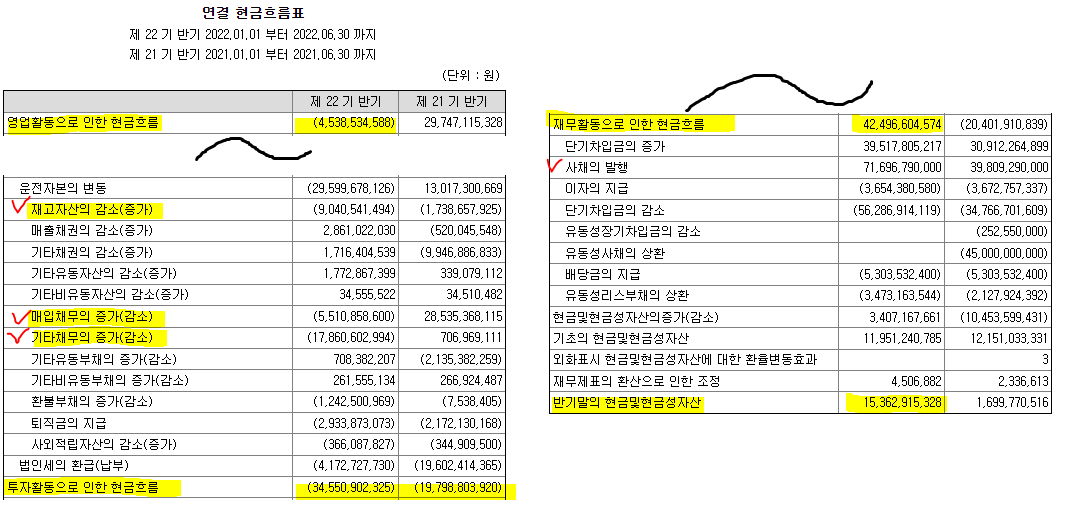 해태제과식품 2022년 반기 기준 현금흐름표 정리 /출처 해태제과식품 2022년 반기보고서 이어서 2022년 반기 기준으로는 재고자산의 증가, 채무의 감소 등으로 영업활동현금흐름이 마이너스를 보였습니다. 재고자산이 소진된다면 큰 무리없이 영업활동현금흐름은 한 해가 지나갈 수록 플러스로 전환될 것으로 보입니다.