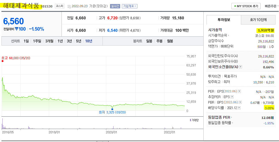 출처 네이버금융 마지막으로 해태제과식품 주가전망을 하면서 글을 마무리하겠습니다. 우선 2022년 9월 23일 장마감 기준 해태제과식품 시가총액은 1,910억 원이며 주가는 6,560원에 형성되어 있습니다.