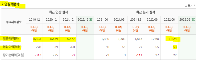 출처 네이버금융 다음으로 해태제과식품 재무비율을 살펴보면 영업이익률은 3~4% 수준으로 다소 낮은 편입니다. ROE의 경우에도 당기순이익 자체가 마이너스이다보니 부진합니다.